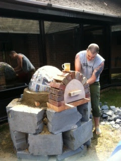 Whilst we were preparing the cob (three and a half hours of puddling) the newspaper that we had wet and draped over the form had dried out and blown all over the place, so this had to be rewetted and put back on, as this paper stops the clay bonding to the sand form inside and potentially ruining the final product.
